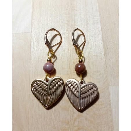Boucles d'oreilles rhodonite cœur aile d'ange