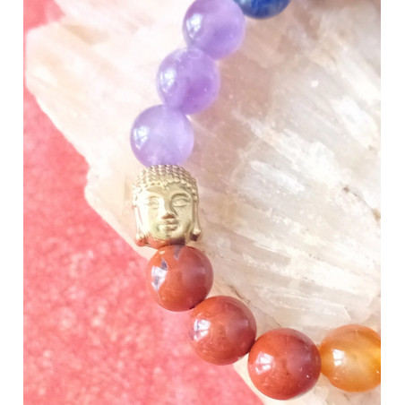 Bracelet 7 chakras bouddha doré (améthyste, lapis lazuli, sodalite, quartz rose, œil du tigre, cornaline, jaspe rouge)
