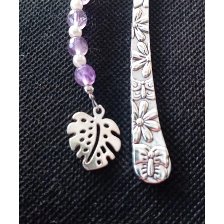 Marque-pages créée à la main avec pierres naturelles d'améthyste et perles nacrés, feuille en acier inoxydable.