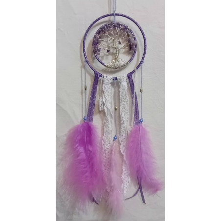 Arbre monté avec fil argenté, dentelle blanche, ruban violet scintillant, plumes rose et fuschia, perles argenté, verre bleu