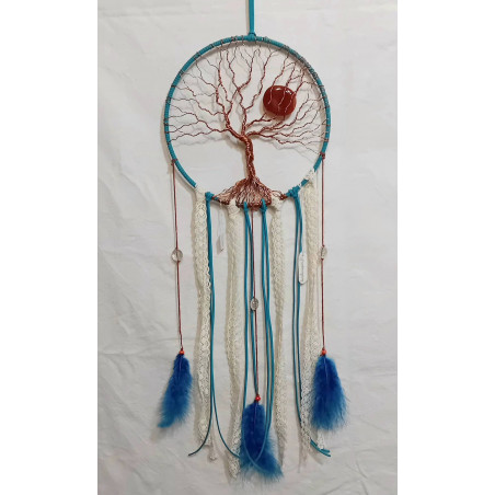 Arbre monté avec fil de cuivre, suédine bleu canard plumes bleues, perles rouge orange