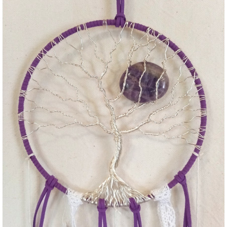 Arbre monté avec fil argenté, suédine violette, dentelle blanche, plumes fuschia, perles doré motif lotus