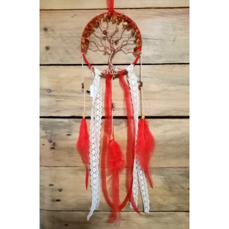 Arbre monté avec fil de cuivre, pépites d'ambre, dentelle blanche, organza et plumes rouge, perles cuivré motif fleur