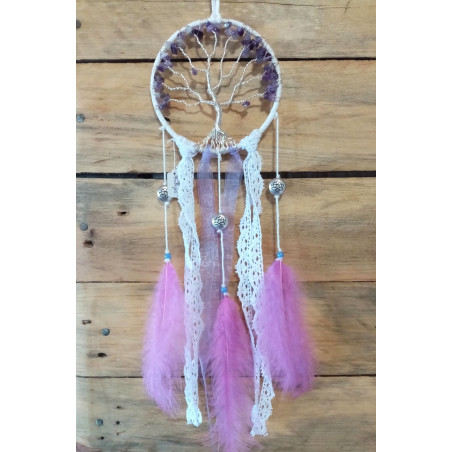 Arbre monté avec fil argenté, dentelle blanche, organza parme, plumes rose, perles argenté motif lotus