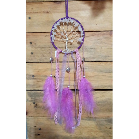 Arbre monté avec fil argenté, dentelle parme, organza violet clair, plumes rose, perles argenté motif lotus