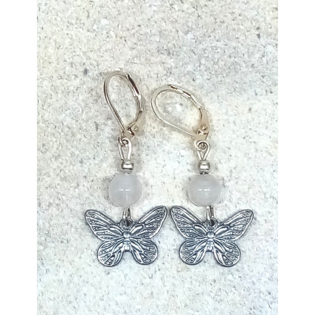 Boucles d'oreilles bien-être quartz rose papillon acier inoxydable